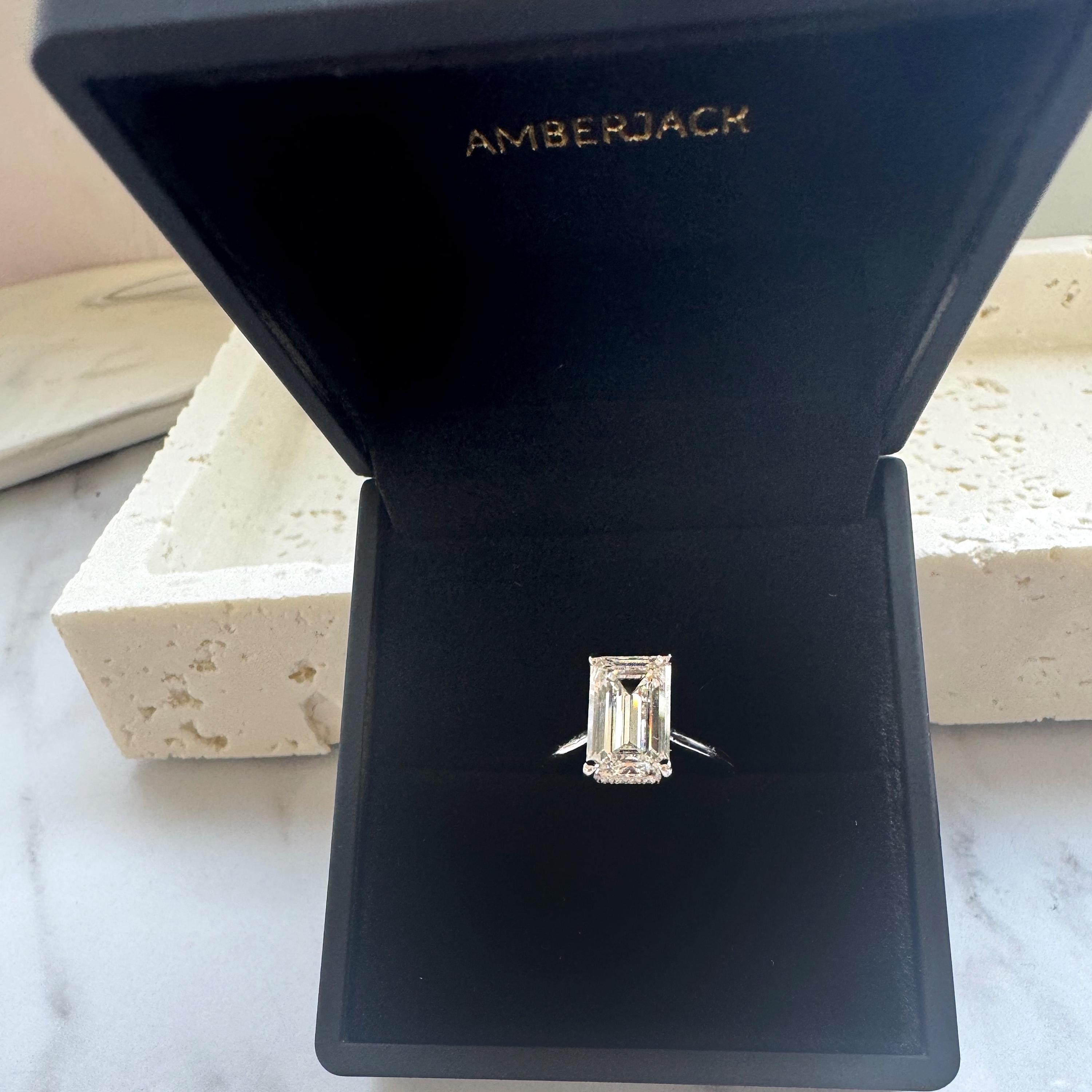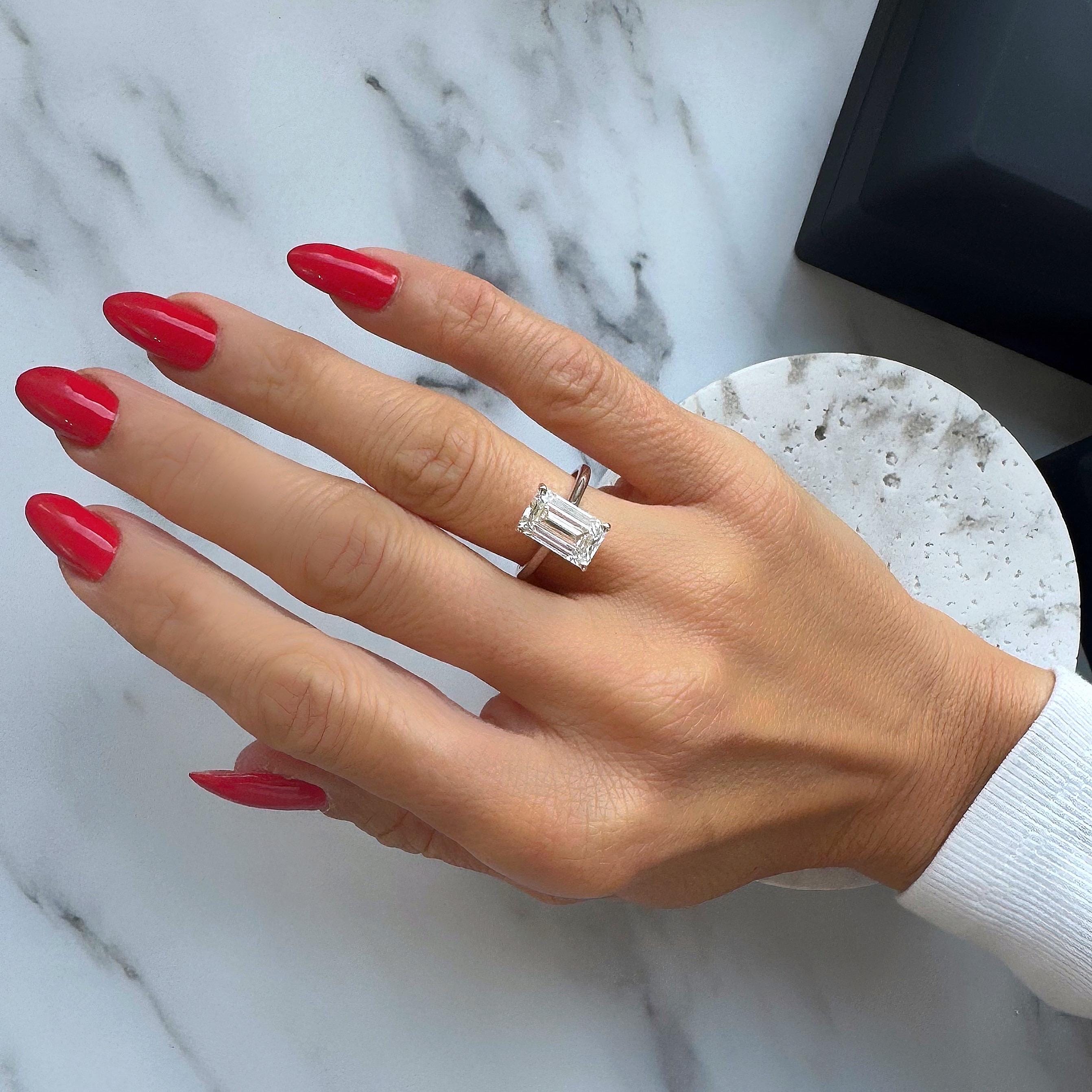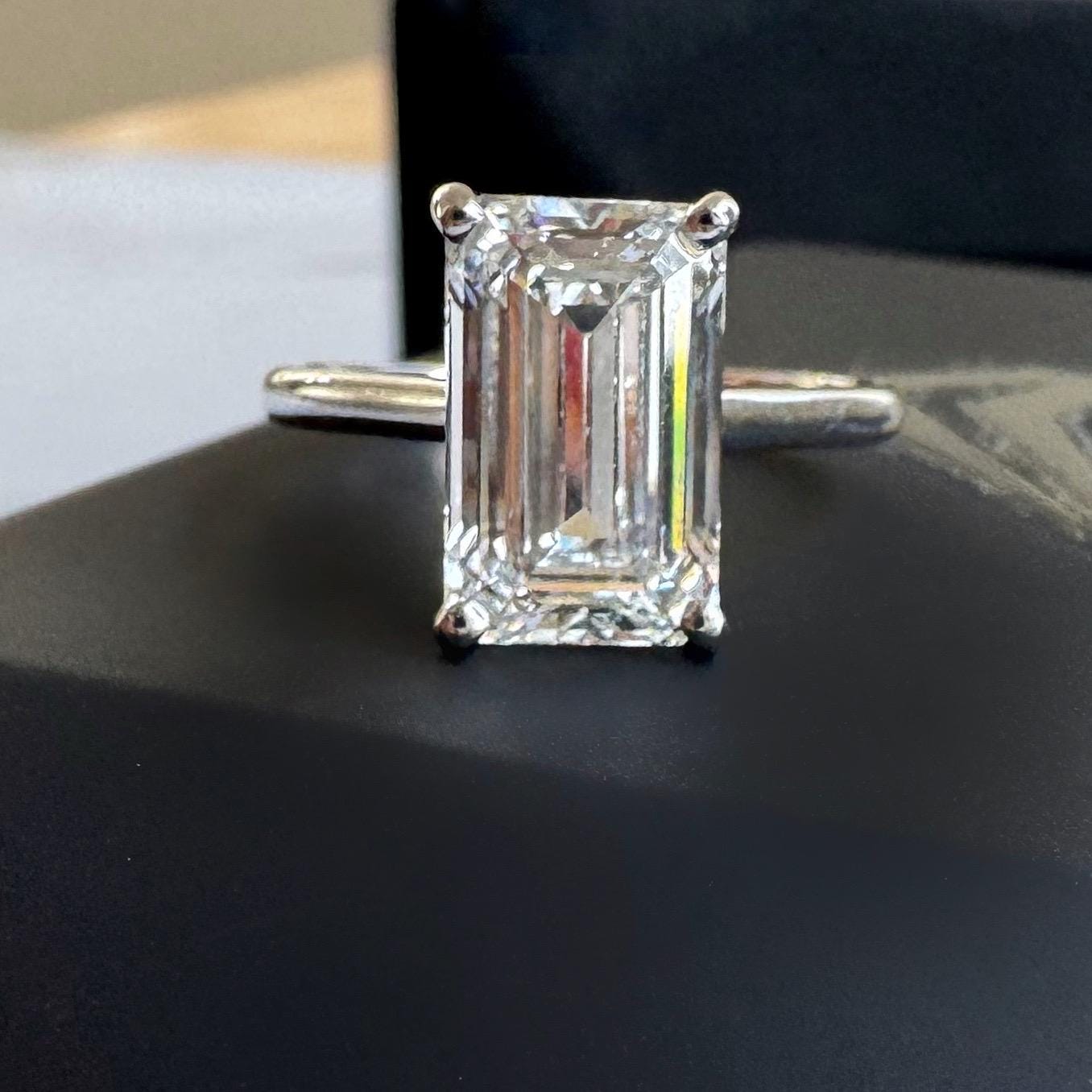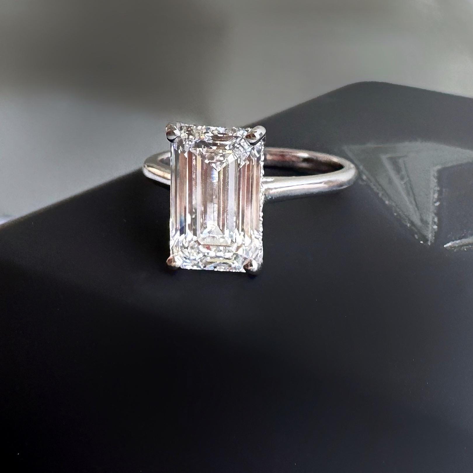 4 Carat E/VS1 IGI Emerald Lab Diamond Ring, Double Diamond Hidden Halo Setting, Big Emerald Engagement Ring, 14k White Gold Clean Plain Band